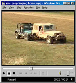 | The red Jeep limps home with the help of the blue Jeep.